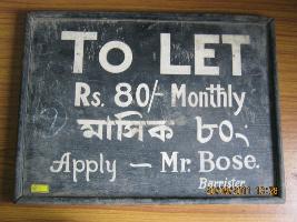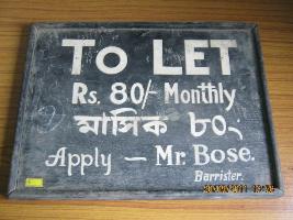 | Description / विवरण | A rectangular black coloured sign board mentions in bold English letters, TOLET. Below it Rs. 80 - monthly and below it in Bengali letters - Masika - 80 - and in last line apply Mr. Bose . Barister is written. |
