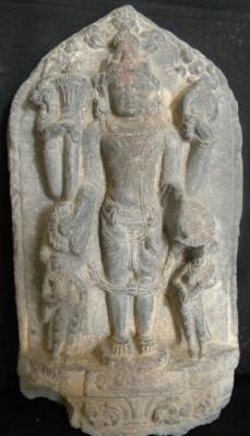 | Description / विवरण | This sculpture depicts an image of lord Vishnu , standing on a lotus pedestal having Gada and chakra on upper right and left hands respectively, wearing Bana Mala , necklace, earrings, armlet on two lower hands, Upabita and waist band, crown, Dhoti . Two female deities are standing beside him and images of other associated deity have been depicted on the stella. |