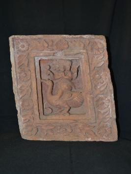 | Description / विवरण | The temple terracotta plaque depicts a deity in seated posture on a bird within floral motifs. |