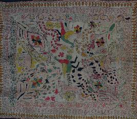 | Description / विवरण | Coloured cotton katha . Red, Green, Yellow, Blue threads are used. Peacocks and floral motifs are seen. |