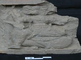 | Description / विवरण | Partly broken terracotta plaque depicts an unidentified deity in seated posture. |