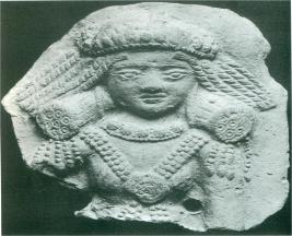 | Description / विवरण | Female figure wearing a headband and loose hair is hanging down. She wears cylindrical ear ornament. There is urna on her forehead. She also wears floral torque, ornament with a medallion on her chest. There is a perforation between the body and the left hand. |