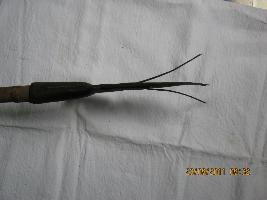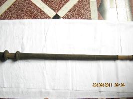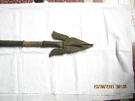| Description / विवरण | A Barbed leaf shaped pointed spear made of brass, having plates in both side which give it extra strength due to flexibility of brass.The plate is out of it setting. Now it looks like a bifurcation on both side. Its end is like a tube, the wooden handle is insert on this tube. Two brass handle cover having rings in both end. This to cover having rings in both end are found at the base. Beautiful scroll work engravings on it give a magnificent look. |