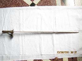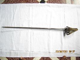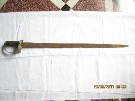 | Description / विवरण | Straight Sword having a straight blade single edge with leaf shape point meant for thrusting. Hilt is made of wood, having resin cover, copper made knuckle guard , cutting decoratively for make it light. Up on the knuckle guard one English letter T is depicted having a square inverted bracket under it. Pommel is totally absent. It is used for both purpose, like cutting and thrusting. |