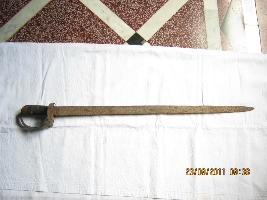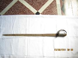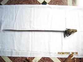 | Description / विवरण | A straight blade having no cutting edge. Both sides are blunt with a leaf shaped point. It is only for thrusting.Pommel is totally absent. Only knuckle guard made of copper is present. Resin cover on wooden handle is bound by iron strings. A copper plate is covering the back of hilt. |