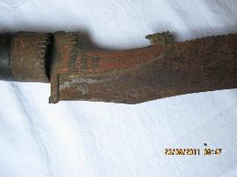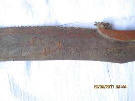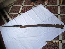 | Description / विवरण | A curved flat blade with sharp cutting edge. Cutting edge is curved, having siscus near its hilt. The opposite side is barbed in front portion and from middle toothed like a saw edge. A Langet attached to hilt designed as a lion head and a peacock head having small horizontal grove mark decoration. A floral scroll work is running on back edge of this blade.Handle is made of wood with circular thread like grooves in series. Three circular rings made of brass is noticed on the handle. |