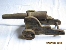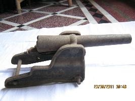 | Description / विवरण | This cannon consists of a tapered, rolled steel barrel, cylinder bored, mounted on a shapely cast iron carriage having heavy iron wheels. Only one wheel exists now. The right side wheel is missing. Its breech bolt is present. It has W.R.A. CO, trade mark and registered in U.S.A. In its catalogue it mentions as Winchester breech loading cannon fro saluting and celebrating. |