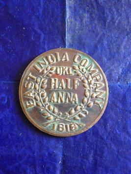 | Description / विवरण | It s a Hanuman paisa holding a mountain in his left hand and a Gada in his right hand with two leaves. A chadar is on his shoulder and a crown on the head. On the reverse UKL Half Anna 1818. East India Company is written. |