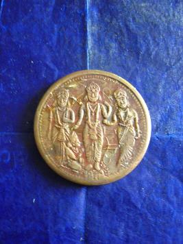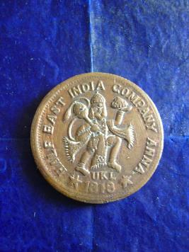 | Description / विवरण | It s a copper coin. On the obverse side of the coin Rama, Lakshman and Sita are shown on the throne in a standing pose and devote Hanuman is noticed in a kneeling pose. On the reverese of the coin Hanuman is seen in a flying mode. U K L 1818East India Company is written. |