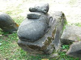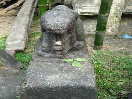 | Description / विवरण | It is a Bull sculpture fixed on a Sand stone. slab and again attached on a laterite slab. Its back is eroded and repaired with a cement plaster. |
