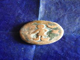 | Description / विवरण | It s a copper seal on which a boy is standing and a half circled moon is noticed on it. The obverse is green coloured.The reverse side not visibel and pasted with paper. |