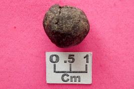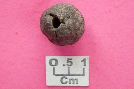 | Description / विवरण | Short roughly round bead, poor quality of clay disfigured during making perforation, grey in color, ill fired perforation in the centre |
