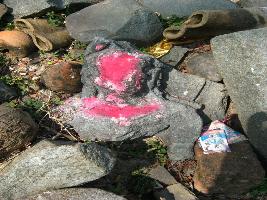 | Description / विवरण | It s a broken female deity. Its lady portion is broken and un-identfied is corverd with vermillion mark. |
