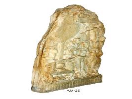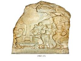 | Description / विवरण | A broken dome panel of stupa. It portrays the depiction of worship of Bodhi Tree. On the right side is a throne, below it is a pair of Buddha padas and on the throne are cushion seats. Lions are shown supporting the throne on front side. Behind the throne is Bodhi Tree. On the left side is a pair of persons one is a royal person keeping their hands on their hips, standing in tribhanga in cross legged postures witnessing the worship of the throne by a pair of dwarfs in anjali behind the throne. A devotee in anjali mudra, a person in anjali riding over an elephant and another devotee below the elephant are other notable features. The upper panel is broken and figures are not clear. |