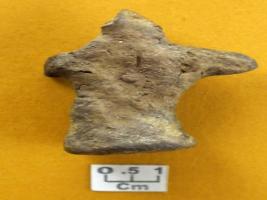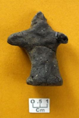 | Description / विवरण | Stylized small human figure with blocked hands and a wide circular base. Head slightly broken and nose made by pinching. Left hand turned forward with a perforation at the centre while right hand stretched at side. |