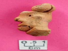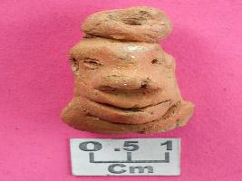 | Description / विवरण | Handmade human head, probably detached from an object, prominent nose with punctured nostrils, punctured eyes, pressed ears, wide and cut mouth, thick lips, prominent chin, coiled hair arranged in bun on the head. |