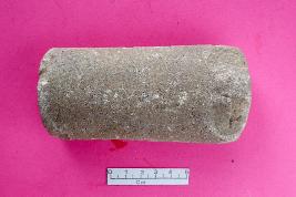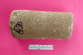 | Description / विवरण | Made of quartzite, cylindrical in shape. One end broken, concave on two sides due to use. |