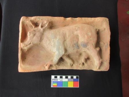 Terracotta Plague depicting a moving boar, the boar facing right direction. It has big eye, long snout with pointed ears. Its neck and back is marked with incised lines. It has a short tail.