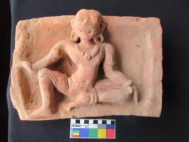 Terracotta Plaque depicting sitting male figure. His face is mutilated. He wears kundala on both ears and necklace on the neck, armband on both arms and anklet on the left leg.Left leg is folded and rest on the floor; while right leg is bending. Both his hands are resting on both knees. His left palm facing downwards.