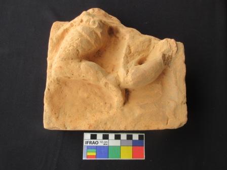 Terracotta Plaque depicting human leg figure in flying position. The body portion is missing. Only left hand and left leg is visible. Left leg is raised behind, feet touching the left elbow.