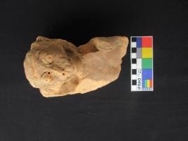 The Terracotta Plaque depicting a monkey. Only the head and upper parts of chest is remaining. Hands, legs and body portion are missing. Its face is mutilated, it has wide open eye, sharp eyebrow and nose is broken.