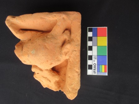 The figure depicts an elephant with hauda on the top. The head and front part of body is missing.Two legs of the elephant are visible, one on the front and one on the back.