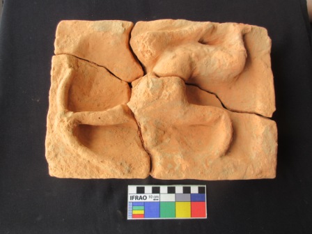 The figure depicts a male figure holding bow on left hand, right hand is half raised. Head is missing. He folded left leg and right leg is bending.