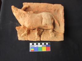 Terracotta Plaque depicting bull. Face is raising towards sky. Face is mutilated. It has two horns. Humped is broken. Only three legs are remaining, all of them are partly broken. Its tail is hanging down