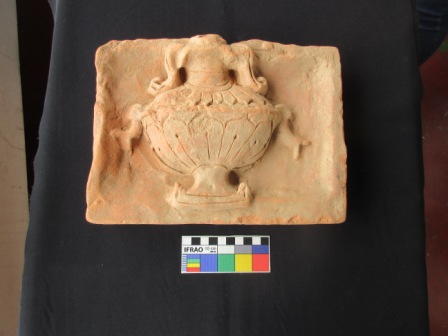 Terracotta Plaque depicting a Purna-ghata with foliage. The foliage is shown on the top and the middle side of Purna-ghata. The ghata is decorated with flower petal.