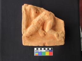 Terracotta Plaque depicting a human figure. His head and right hand is missing. No ornaments attribute the figure. He has three round finger on the left hand.