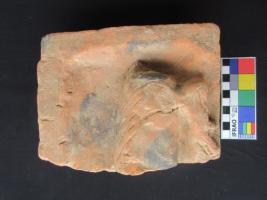 Terracotta Plaque depicting hind part of animal. The front body of animal is missing. Only one hind leg in bending position with hoof and hind body part is visible. Tail is damaged. There is angular incision marks on the dorsal side of the body.