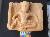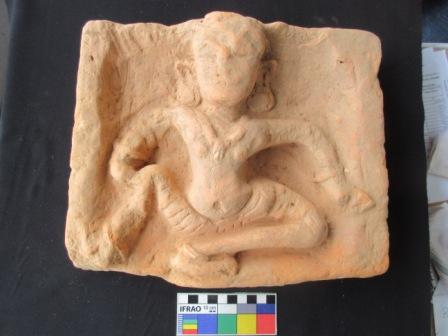 Terracotta Plague, depicting a sitting male figure. There is no clear depiction of the face. Two ears with kundala are visible. He wears necklace with pendent in the neck. The right hand rest on his right knee. He wears a bangle on both hands. The left hand hanging down near the left knee. The left leg is folded and right leg is bending.