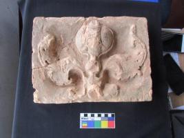 Terracotta Plaque depicting a lotus bud with foliage on either side.