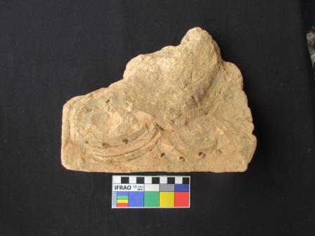 Terracotta Plaque indeterminate pattern. It has two sets of symmetrical semicircular mark facing opposite direction on the right bottom side it has four circular depression at the end of semicircular line,on the left side three such depression are visible on the topmost semicircular line.
