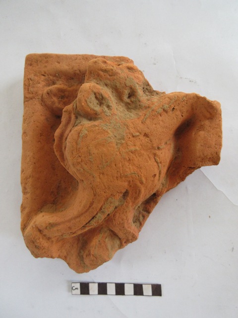 Elephant head, trunk is shown raising upwards, tongue is jutting out from the month. Two projected ears are shown, eyes not visible.
