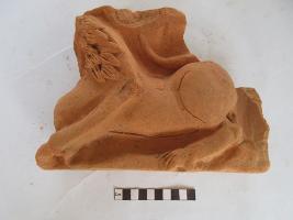 Lion is depicted. Head part is missing; Some part of tail is broken. It is shown in crouching position. Only 2 legs are visible. Mane is visible. Mane covers the shoulder and is marked with various no. of incision mark.
