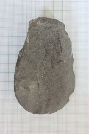 A bi-facial dark grayish dolerite axe with a heavy truncated oval shaped butt end and has a sharp rounded cutting edge.