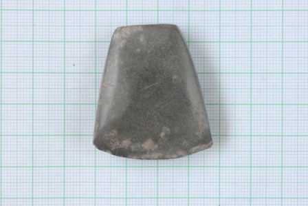 The small dark grayish dolerite trapezoidal celt is having metallic luster, has a rectangular long section and transverse rectangular section. It has a truncated and rectangular butt end.