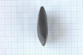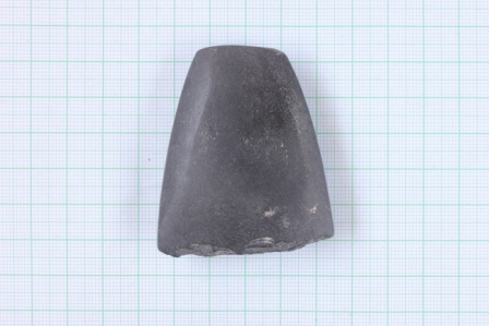 An adze of blackish dolerite stone roughly trapezoidal in shape. One broad face is flat while other is curvilinear. The cutting edge is broken and chipped off.