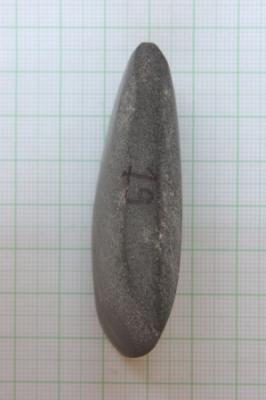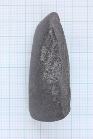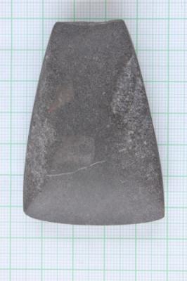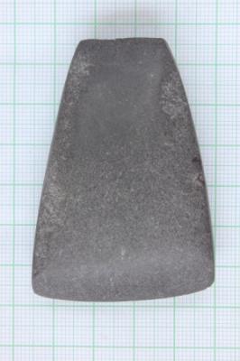 The trapezoidal shape celt has a slightly curvilinear bifacial cutting edge with lenticullar long section with a rectangular butt end.