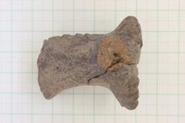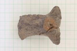 The terracotta animal figurine seems to be the head portion of a horse decorated with wavy incision marks to show the anatomical features, mainly in its snout and neck. Left ear of the object is intact while its right ear is broken.