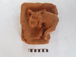 Tiger head. The body part is missing. It has two big eyes, pointed ears and open mouth. The teeth in upper jaw are clearly visible. Two whiskers are shown as incision mark on the nose.