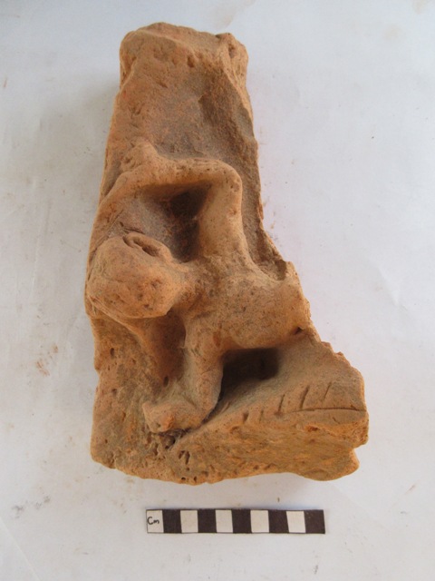 Male figure. Face is mutilate.one ear is visible. Both his hands are raised above. He holds unknown object on his left hand. No ornaments attribute him. Leaf like design is there on his right side.