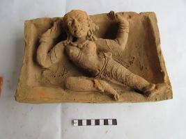 Female figure in flying position. She has two eyes with eye brow. Nose is partly broken. She has smiling face. She has two ears, necklace with pendant disc on the neck. Three bangles on the left hand, two bangles on the right hand and anklets on the legs. Both two hands are half raised. Right leg is folded and left leg inclined to the left flank. She has braided hair. She is wearing drapery. Below the arm there is incised decoration like wings.