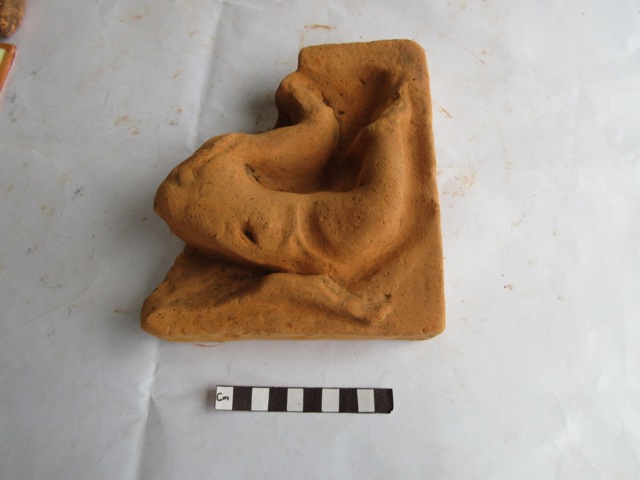 Body of human figure-missing head and right hand. The figure appears to be arching back. The left hand is raised. Left leg is bending. The feet pointing upwards and right leg is folded.