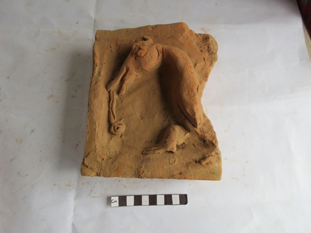 Swan head. Body is missing, swan mouth carrying lotus flower. Right leg is placed in front and left leg is broken. Flower is shown as upside down. The flower is shown as circular disc with two incision mark and circular in the centre