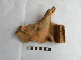 Swan figure. The figure shown appeaerd to be in motion. The head is facing upward. Beak is slightly open and it has one eye. One leg is missing, tail is broken. There is a parallel wavy line at the edge.