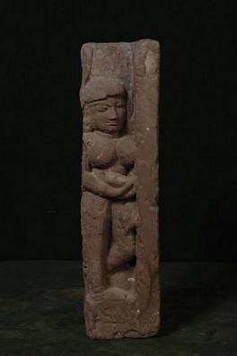 | Description / विवरण | Upright, thin stone fragment showing a female figure holding a bowl pot in her lowered right hand. Her left hand is placed on the left thigh. |