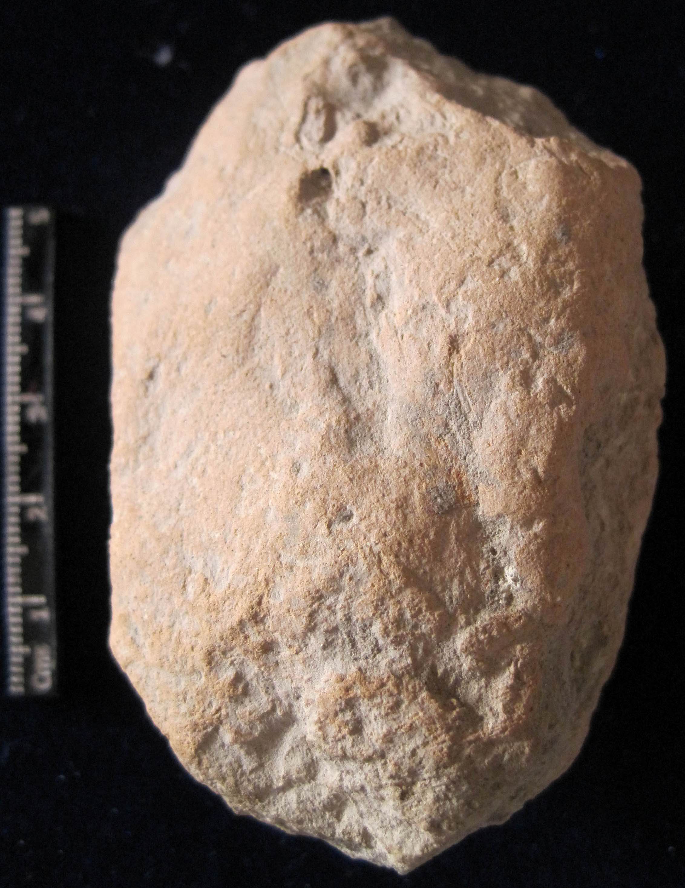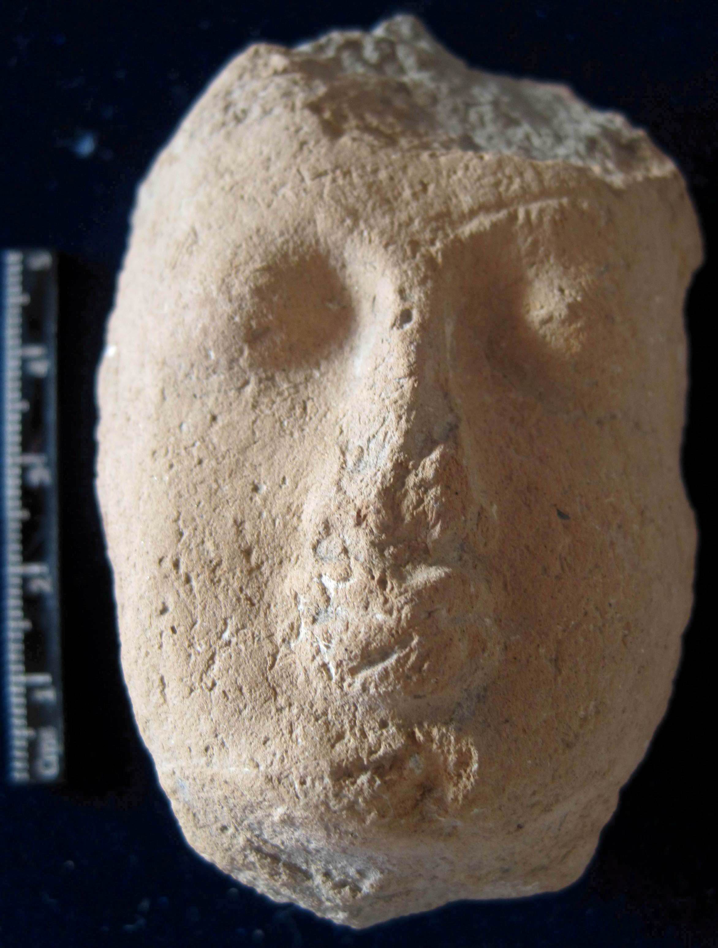 Round shape face with prominent nose, half open eye, it seems to be Buddha head,