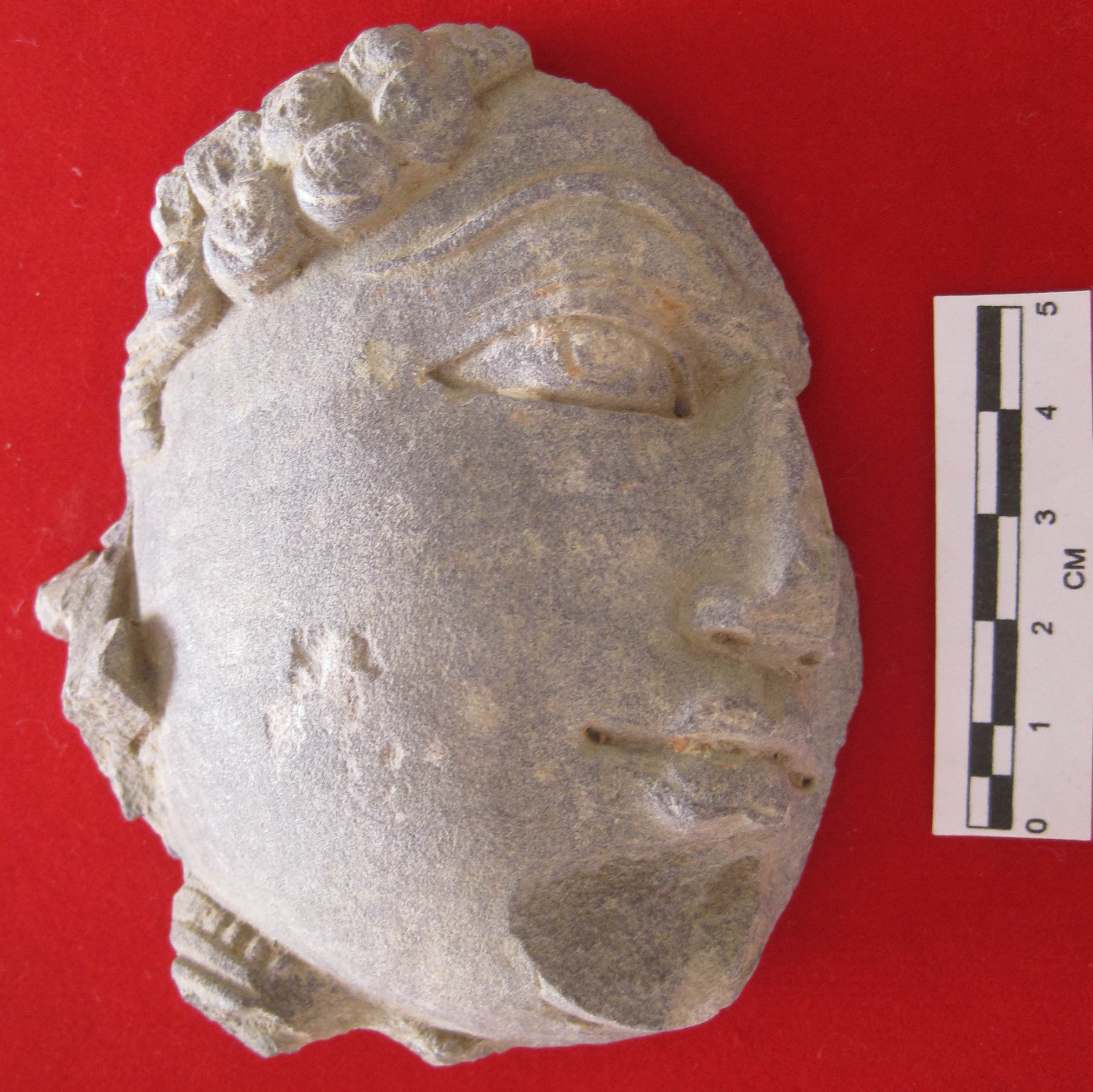 Beautiful broken stone sculpture with curly hair style, sharp nose beautifully carved leaps with opening smiles